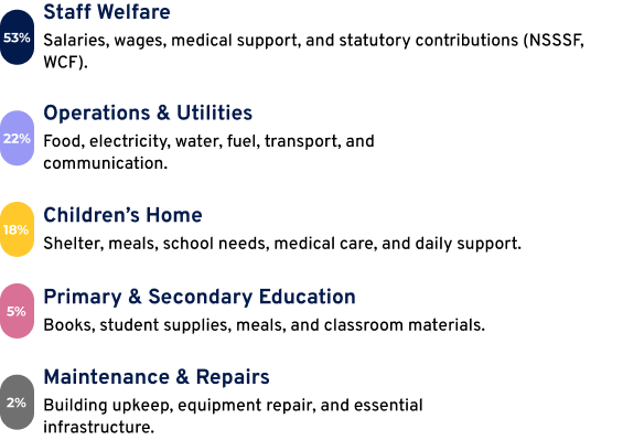 Daily operations also require steady spending on food, electricity, water, fuel, and maintenance, along with repairs to keep the campus functional. The Children’s Home alone requires over TZS 14.5 million for basic care within this period.